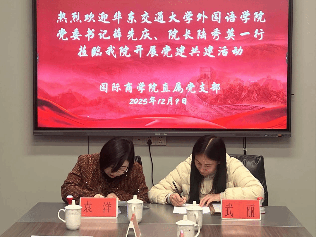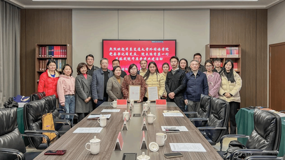 为深入学习贯彻党的二十届四中全会精神,推动基层党组织建设提质增效,12月9日,华东交通大学外国语学院外语专业教工党支部与江西枫林涉外经贸职业学院商学院直属党支部党建共建签约仪式在江西枫林涉外经贸职业学院举行。华东交通大学外国语学院党委书记薛先庆,院党委委员、院长陆秀英,江西枫林涉外经贸职业学院党委委员、副校长蒋诗文,党建工作领导小组副组长刘朝武出席会议,双方学院领导及教师党员代表参加会议。仪式由江西枫林涉外经贸职业学院党建工作领导小组副组长刘朝武主持。