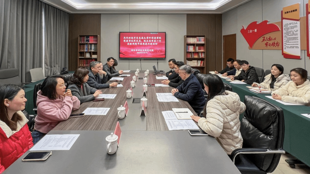双方共同观看了江西枫林涉外经贸职业学院宣传片,陆秀英简要介绍了外国语学院院情。薛先庆介绍了学院红“译”站党建品牌 ,并指出两院办学特色相通,此次党建共建既是交流学习的契机,更是共谋发展的起点,他从构建“党建+育人”协同机制、搭建“党建+科研”合作平台、打造“党建+服务”实践载体三个方面对两个学院党建共建提出殷切希望。