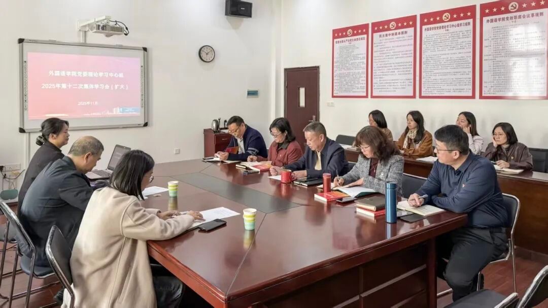 11月17日,外国语学院召开党委理论学习中心组2025年第十二次集体学习(扩大)会,深入学习党的二十届四中全会精神,奋力开创学院高质量发展新局面。学院党委书记薛先庆主持会议,理学院党委书记吴效葵、党委组织员党姗列席督导,学院各党支部书记、科级干部参加学习。